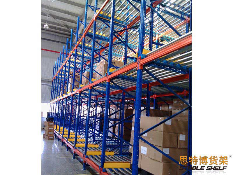 The gravity shelf is also called the roller shelf, which belongs to the pallet storage shelf in the storage shelf. The gravity shelf is one of the derivatives of the beam shelf, the shelf structure is similar to the beam shelf, but the drum track is installed on the beam, and the track is tilted 3-5°. Pallet goods are transported by forklift to the purchase port of the shelf, and the pallet automatically glides from the entrance to the pick-up port at the other end by using its own weight. The gravity shelf is a first-in-first-out storage method.